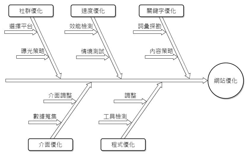 ↑魚骨圖(Fishbone Diagram):本圖以網站優化為例,列出各大項主因(社群優化、速度優化、關鍵字優化、介面優化、程式優化)、及大項內的細項。
