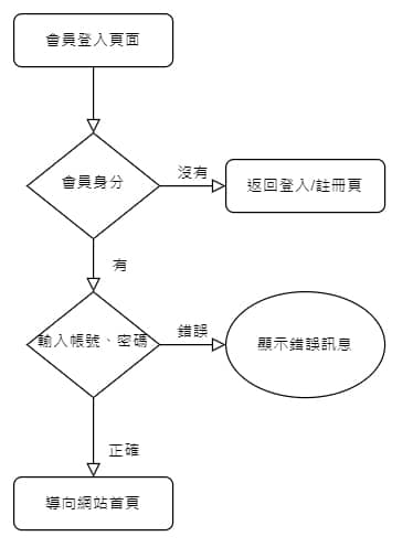 ↑流程圖(Flow Chart):本圖以網站會員登入判斷為例,有助於快速建立邏輯、釐清架構